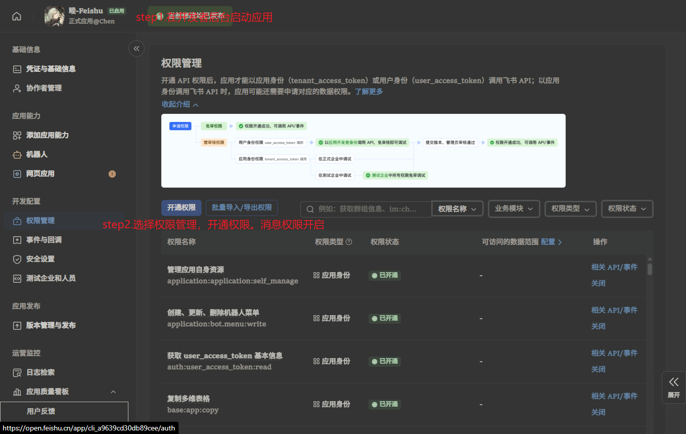 im:chat:readonly和im:message:send_as_bot等消息读取权限(否则单向通讯) - 将机器人加入群聊或私聊,发送